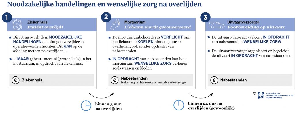 • Brochure SJG: Informatie voor nabestaandenAls de noodzakelijke handelingen verricht zijn, kan de uitvaarverzorger die u daartoe opdracht hebt gegeven het lichaam ophalen in het mortuarium. Gebeurt dat niet binnen 3 uur, dan is de mortuariumbeheerder gehouden om het lichaam gekoeld te bewaren. Een commissie van wetenschappers en specialisten heeft vastgesteld dat koeling noodzakelijk is om het lichaam te conserveren. De mortuariumbeheerder over tot koeling, ongeacht of nabestaanden daartoe een expliciete opdracht hebben gegeven, omdat hij de zorg voor de overledenen heeft aangenomen (zaakwaarneming, artikel 6:198 Burgerlijk Wetboek).